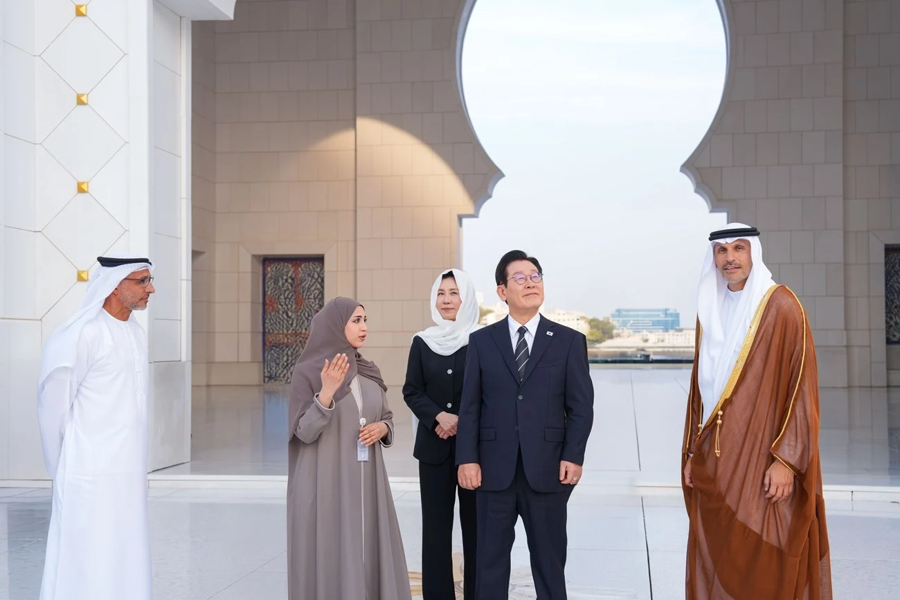 استقبلت أبوظبي فخامة لي جيه ميونغ، رئيس جمهورية كوريا، في جامع الشيخ زايد الكبير، ترافقه حرمه السيدة الأولى كيم هي كيونغ، كما حضر المعالي خلدون خليفة المبارك، رئيس جهاز الشؤون التنفيذية ورئيس بعثة الشرف المرافقة للرئيس الضيف، وعبدالله سيف النعيمي، سفير الإمارات لدى كوريا، إلى جانب عدد من الوزراء وكبار الشخصيات في جمهورية كوريا.