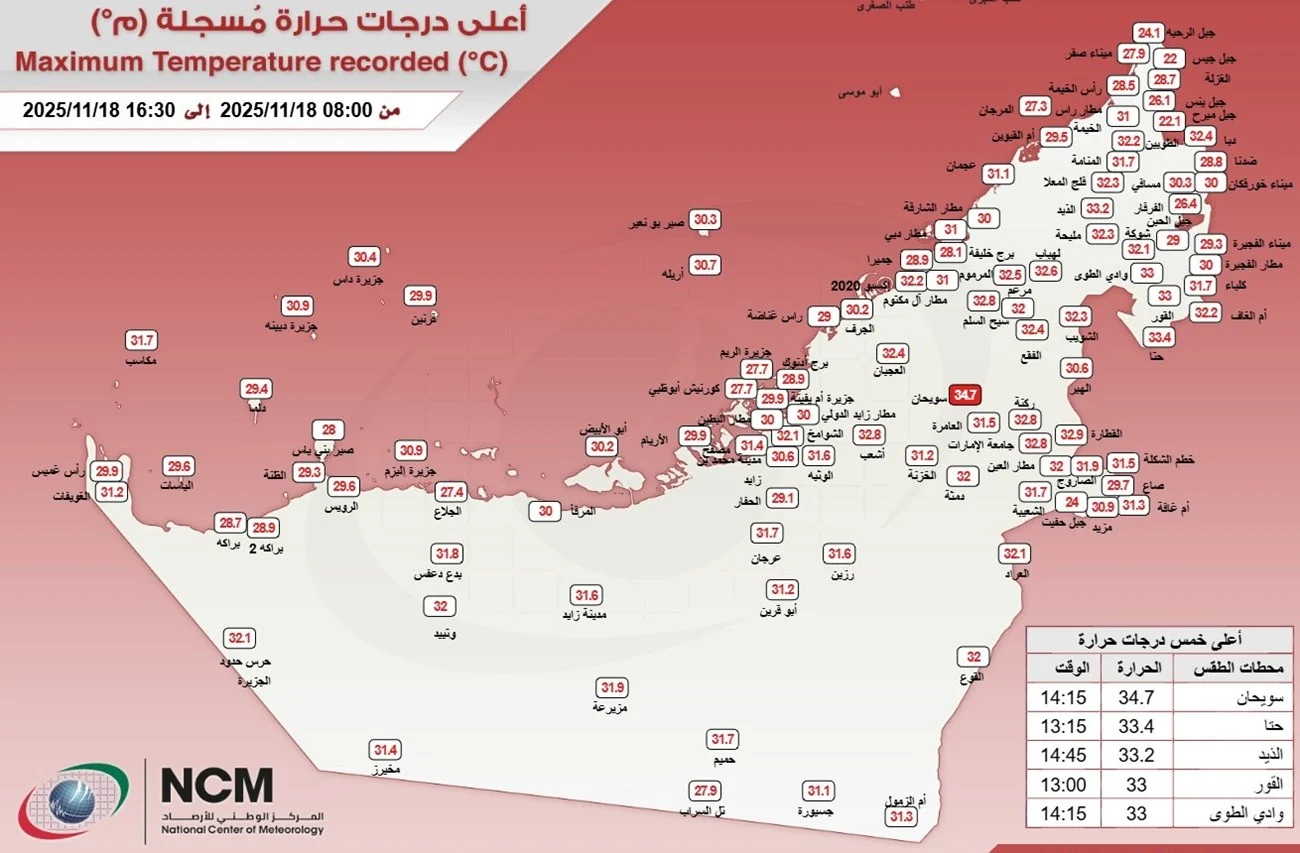 سجلت دولة الإمارات اليوم أعلى درجة حرارة بلغت 34.7 درجة مئوية في سويحان (العين) عند الساعة 14:15 بالتوقيت المحلي.
