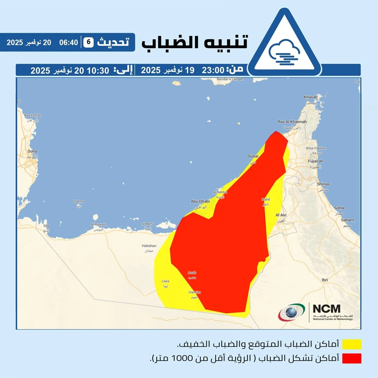 ينذر المركز الوطني للأرصاد بتشكل الضباب في بعض المناطق بالدولة صباح الخميس، مع انخفاض مدى الرؤية الأفقية إلى أقل من 1000 متر في المناطق المتأثرة.