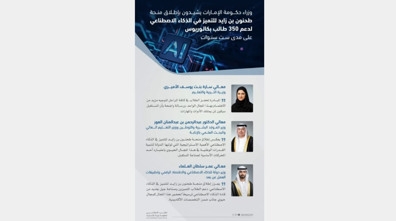 أشاد عدد من وزراء حكومة الإمارات بإطلاق منحة طحنون بن زايد للتميز في الذكاء الاصطناعي التي تهدف إلى دعم 350 طالباً من طلبة البكالوريوس على مدى ست سنوات، وتمكين جيل جديد من الخبراء ورواد الابتكار في مجالات الذكاء الاصطناعي.