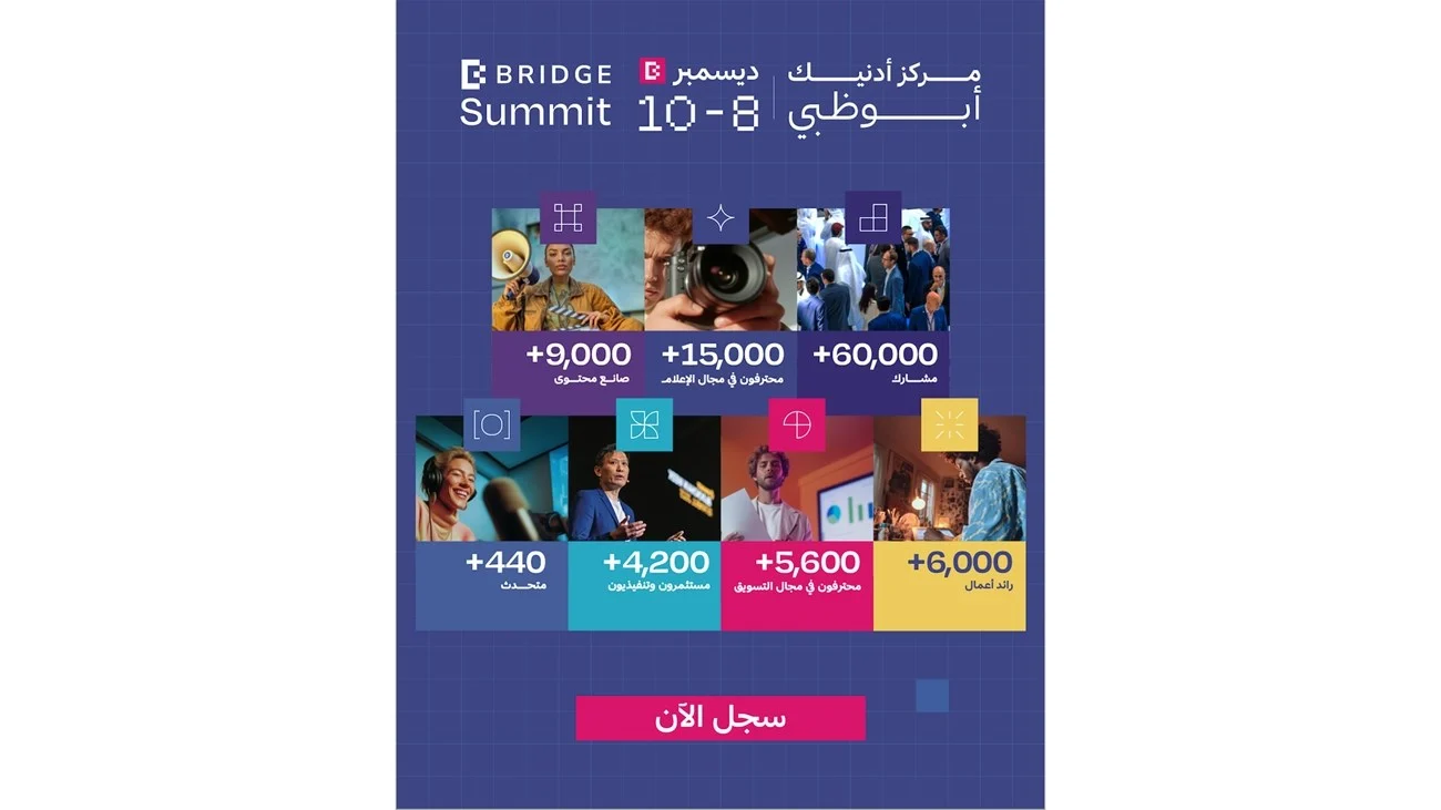 تنطلق فعاليات الدورة الأولى من «قمة بريدج» في العاصمة أبوظبي، لتجمع بلدان العالم نحو 60 ألف مشارك من 132 دولة، مع مشاركة 430 متحدثاً من 45 دولة من كبار المبدعين، وصناع السياسات، والمستثمرين، وخبراءTechnology، والمؤسسات الإعلامية، وقادة الثقافة، وتقدّم أكثر من 300 جلسة وفعالية، في محطة مفصلية لمنظومة الإعلام ومستقبل صناعة المحتوى عالمياً.