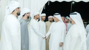 زار سمو الشيخ محمد بن سعود بن صقر القاسمي ولي عهد رأس الخيمة مجلس العزاء في منطقة الظيت ليؤدي واجب العزاء في وفاة المغفور له بإذن الله محمد جاسم الجلاف الزعابي.