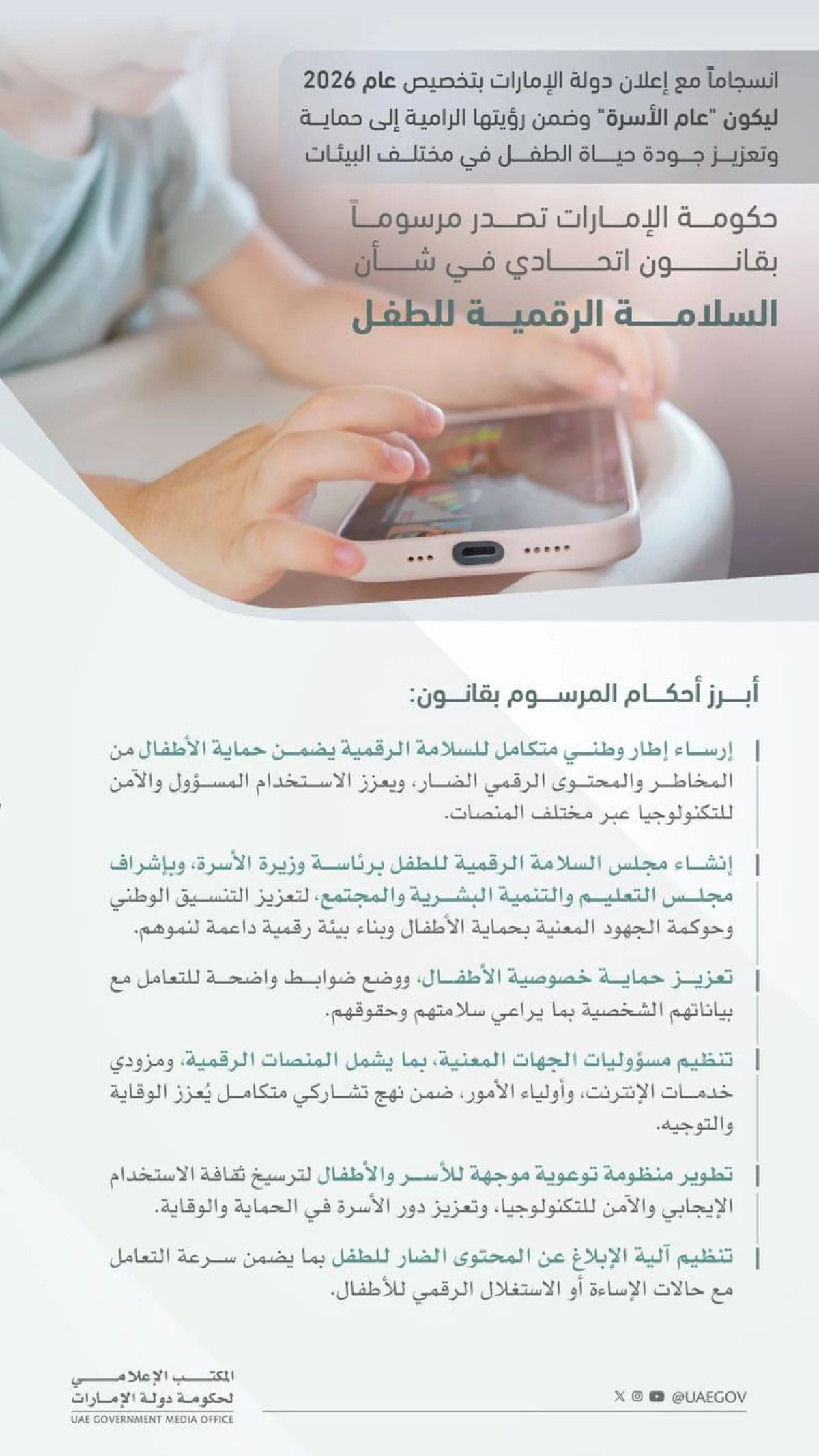 يهدف المرسوم بقانون اتحادي في شأن السلامة الرقمية للطفل إلى تشكيل إطار تشريعي متكامل يهدف إلى حماية الأطفال من المخاطر الرقمية وتشجيع الاستخدام المسؤول والآمن للتكنولوجيا بما يتوافق مع أعمارهم واحتياجاتهم التنموية، في إطار إعلان الإمارات أن عام 2026 سيكون “عام الأسرة” ورؤية حماية وتعزيز جودة حياة الطفل في بيئات متعددة.