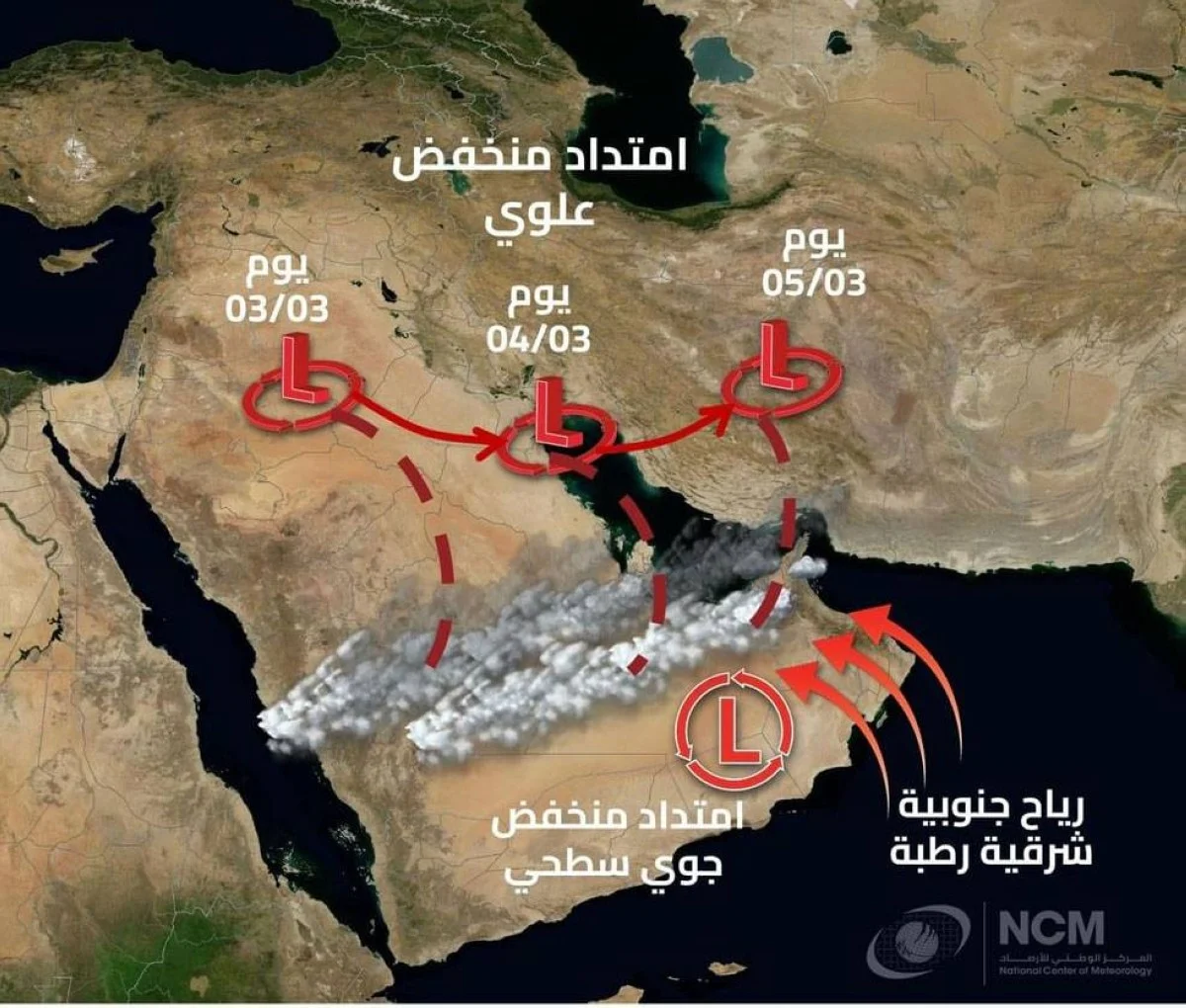 أما حالة البحر، فمن المتوقع أن يضطرب تدريجياً في الخليج العربي اعتباراً من ليل الثلاثاء وحتى الخميس، فيما يكون خفيفاً إلى متوسط الموج في بحر عُمان، ويضطرب أحياناً.