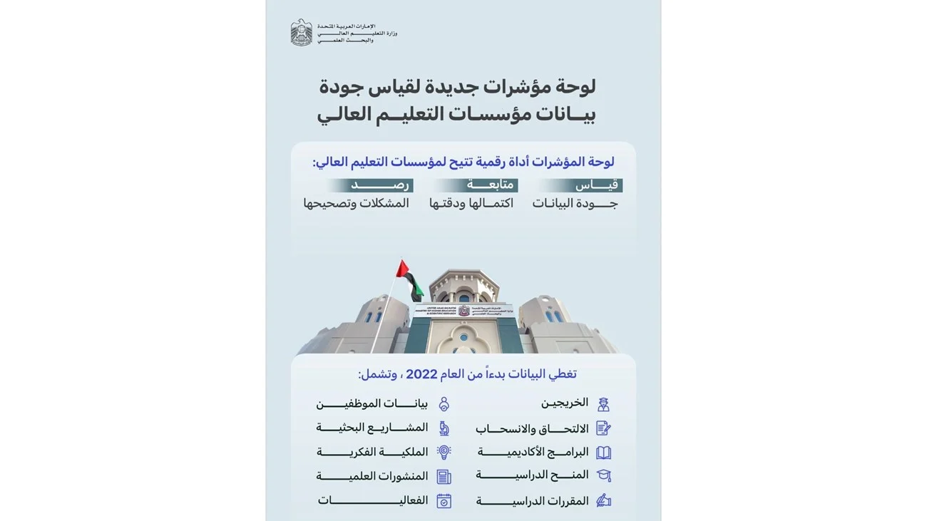 أعلنت وزارة التعليم العالي والبحث العلمي عن إطلاق لوحة مؤشرات جودة بيانات مؤسسات التعليم العالي في الدولة، المعروفة باسم Data Quality Spotlight Dashboard، والتي تقيس جودة البيانات والتقارير الإحصائية وتتحقق من دقتها.
