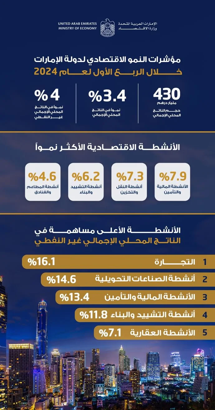 430 مليار درهم الناتج المحلي الإجمالي للدولة خلال الربع الأول من 2024 بنمو 3.4%