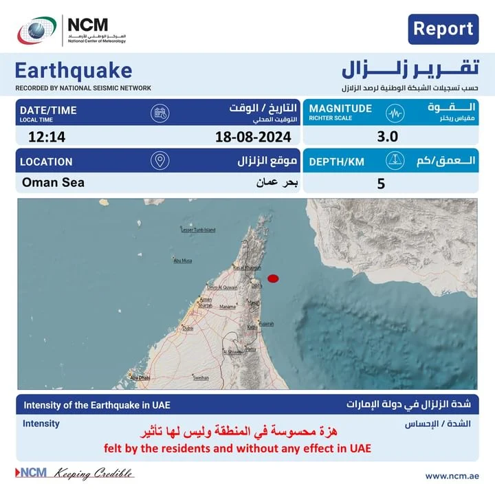 هزة أرضية بقوة 3 درجات تضرب بحر عمان